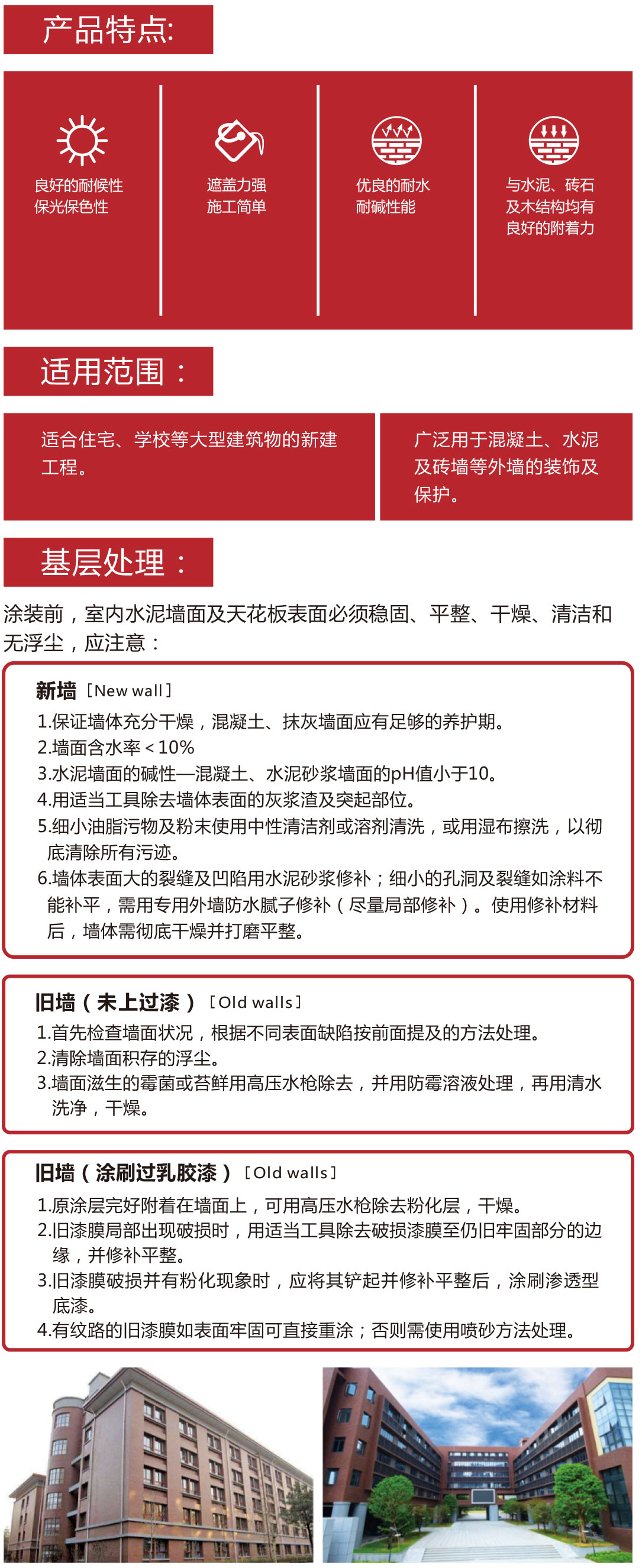 經(jīng)典外墻水漆是一款改性丙烯酸類(lèi)外墻面漆,具有出色的保光保色性能及戶(hù)外耐久性,可廣泛用于混凝土、水泥及磚墻等外墻的裝飾及保護。